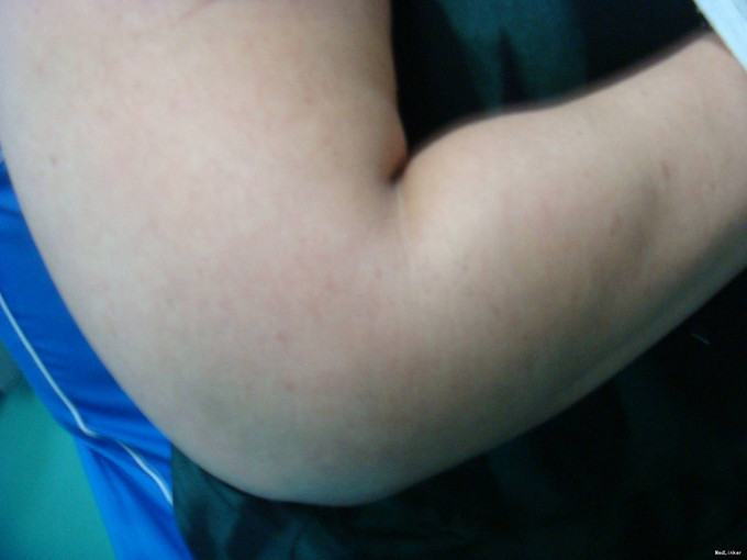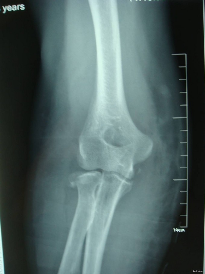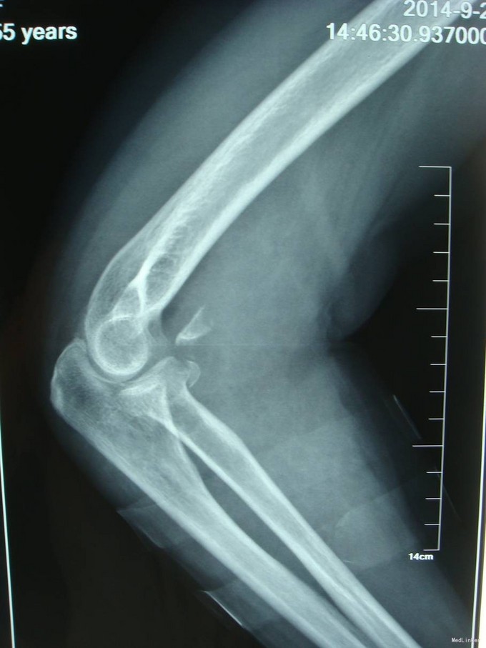 主诉:摔伤后右肘部疼痛10小时 患者自述2014-9-2 早8点自己走路时不小心摔倒,右肘部着地,导致右肘部疼痛、肿胀、活动受限,于当地医院拍片诊断为“右肘关节脱位”,给予手法复位, 为求进一步治疗来我院,诊断为“左肘关节骨折”,并收入我科,患者自受伤以来,无发热,无呼吸困难,无腹痛腹泻,饮食睡眠正常,大小便未见异常。