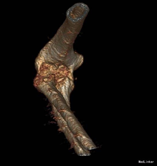 患者步入病房,左肘关节肿胀明显,压痛(+),骨擦音及骨擦感(+),左上肢感觉未见异常,左手指活动正常,左桡动脉搏动可触及。