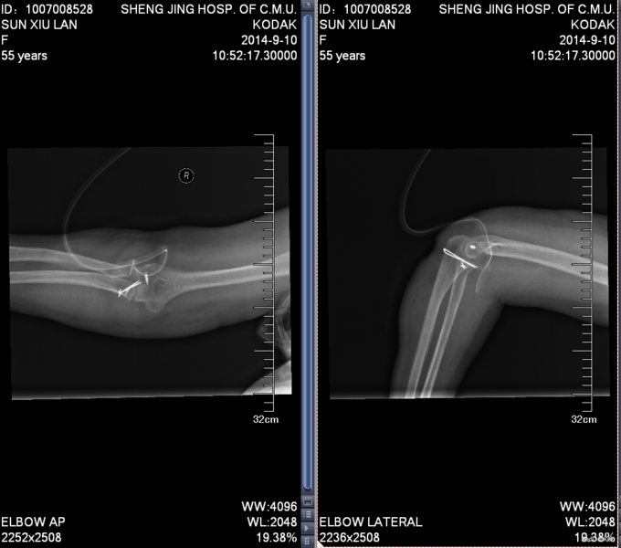 患者入院后左肘关节石膏固定,左肘关节对症消肿等治疗。1周后完善检查后查无明显手术禁忌症后行左桡骨小头骨折切开复位内固定术。