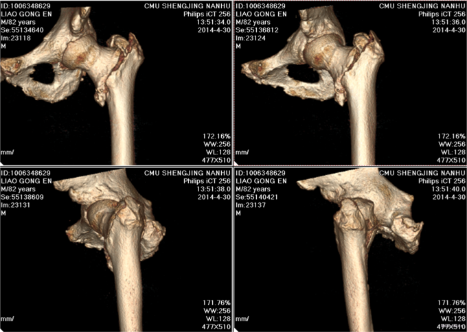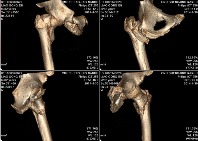 患者2014-04-27日上午9时摔倒后左髋部疼痛肿胀、活动受限,不能站立行走,急来中国医科大学附属盛京医院急诊科,急诊予以行辅助检查,左下肢DR提示:左股骨粗隆间骨折,现患者为求进一步诊治,以“左股骨粗隆间骨折”为诊断收入我科。患者自受伤以来一般状态可,无发热,无头晕、呕吐,无胸闷、心悸呼吸困难,无腹痛、腹泻,饮食可,睡眠可,二便正常。