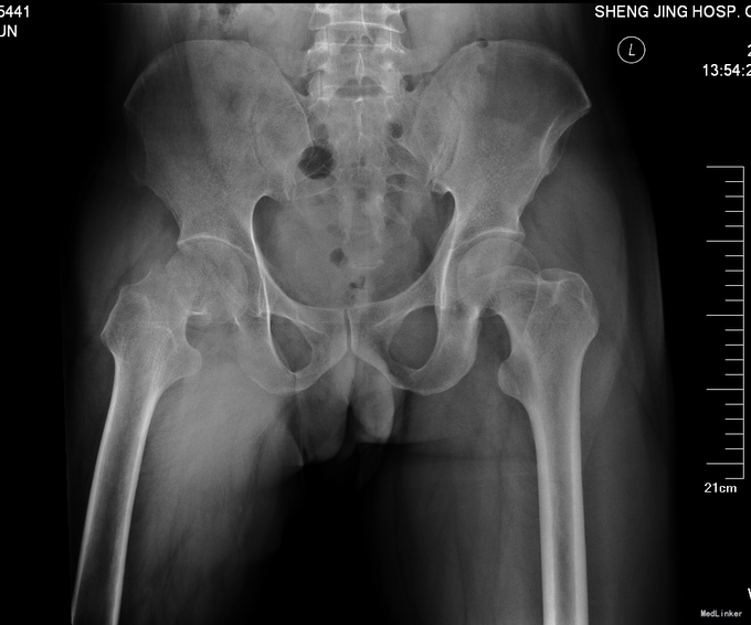 查体右髋部未见明显肿胀及瘀斑,右大腿外旋畸形约45度。右股动脉搏动有力,肢体末梢血运良好,皮温正常。右髋部压痛(+)扣击痛(+)。右髋关节活动受限。