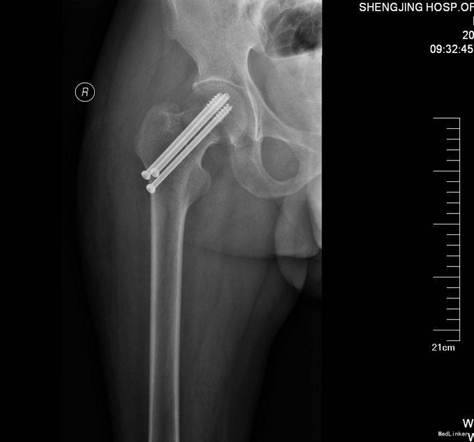 患者入院后完善相关检查,患者未满65周岁,所以择期行右股骨颈骨折闭合复位空心钉内固定术,术后患者3天后出院。