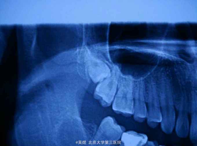 术后一周拆线,伤口愈合良好,无不适。 讨论:上颌埋伏阻生智齿由于操作空间及视野狭窄一般拔除难度相对稍大。但相对于下颌骨上颌智齿周围骨质较疏松。除外高位,水平,牙冠与邻牙紧密接触的类型外,大部分近中阻生的都不需要分牙,一般稍去骨增隙挺松就可拔除。此外,由于上方有上颌窦的存在,特别需注意增隙的力度,术前也应和患者详细交待上颌窦瘘的风险及后续处理。