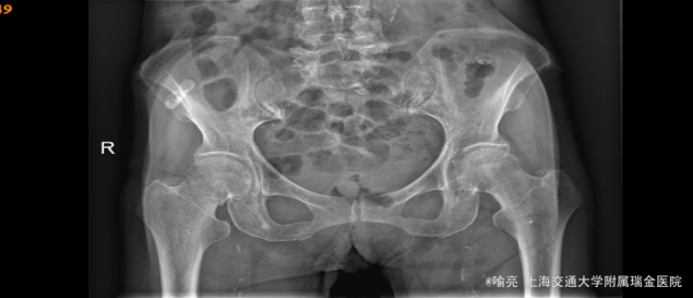 查体:右髋部叩痛(+),右下肢外旋畸形,未见肿胀,血运、感觉未见明显异常,左膝关节、踝关节、足趾活动可,血运正常 辅助: x片示右侧股骨颈骨折