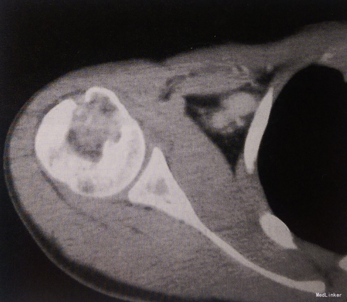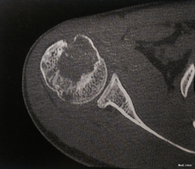 查体肩关节活动正常,无红肿。 影像学表现:CT示右侧肱骨头骨性关节面下可见囊状膨胀性骨质破坏,病灶内部密度不均匀,隐约可见点条状高密度钙化影。边缘分叶状,周边可见硬化缘,无明显骨膜增生和软组织肿胀。