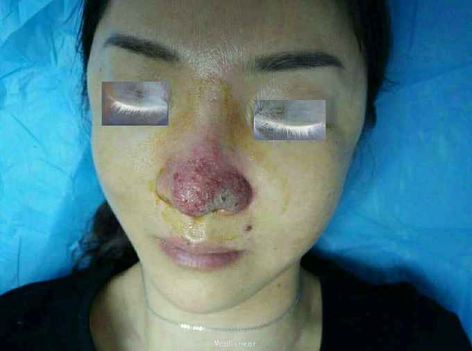 患者女,38岁,因“注射隆鼻术后鼻部红肿伴疼痛7天”入院。入院后创面清创换药,抗感染,改善微循环,高压氧等治疗。