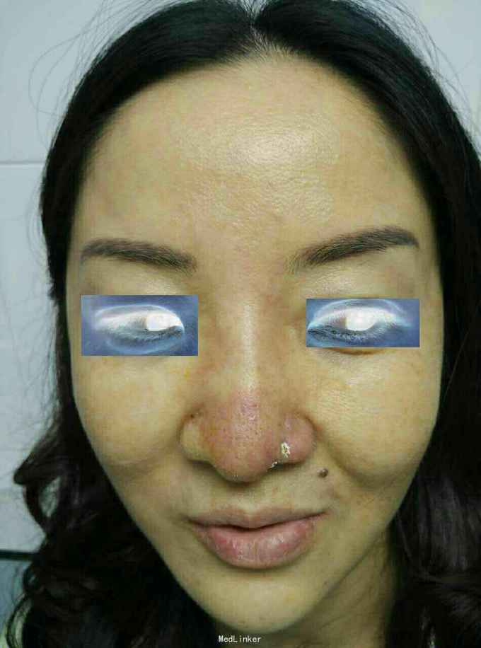 鼻部明显红肿,散在白色脓点,以鼻尖及左鼻翼为重,左鼻翼部分发黑坏死!