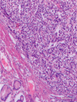 随访:患者出院后因终济原因,一直未进行化疗或放疗,3个月后复查:AFP83.08ng/ml,CEA 2.42ng/ml.但CT提示肝多发性转移瘤。现患者带瘤生存,精神和食欲尚可.一直服用中药治疗。 讨论:肝样腺癌有较特殊的病理学特征,组织学上主要由不同而又密切相关的腺癌区和肝样分化区两部分组成。腺癌区为管状腺癌或乳头状腺癌.而肝样区的瘤细胞特点和排列方式与肝癌相似,细胞大,多边形,胞浆丰富、嗜酸性,部分癌细胞胞浆透亮.核仁大而明显、位于细胞中央,癌细胞组成粱索状或实性窦状,其问被纤维血窦状问质分隔.两者之间有逐渐移行的过程。本病例可见到此病理表现。