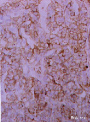 人院后完善相关检查,入院枪查:血红蛋白(Hb)62g/L,癌胚抗原(cFA)2.15ng/ml, CA1 9- 9.85u/ml,甲胎蛋白(AFP)2256ng/ml。钡餐示在胃体部、胃窦部、大弯侧见多个充盈缺损,印象为胃体、胃窦部癌。外院胃镜见胃小弯处有一4cm×5 cm深凹陷溃疡,渗断为胃体低分化腺癌;腹部CT考虑胃小弯及胃窦癌可能,腹腔淋巴结转移。全麻下行剖腹手术,水中探查无腹水.膀胱直肠窝无结节,双侧卵巢无转移,无腹膜播散,肝未触及转移性结节。肿物位于胃小弯,约8cm×6 cm大小,侵及浆膜,活动尚可。胃左及腹腔动脉旁淋巴结肿大并融合。腹腔动脉干处融合淋巴结直径3.5cm。无法切除,遂行胃癌姑息性切除(远端胃大切)加空肠侧侧吻合术。术后病理:送检胃组织牯膜面见一溃疡到肿物,大小为8 cm x 7 cm×3 cm,镜检为肝样腺癌1度分化,浸润至浆膜层。胃左淋巴结4枚中3枚有腺癌转移;胃小弯淋巴结4枚中l枚有腺癌转移。免疫组化结果AFP(+),cK(+),cEA(一),A^r(+),ER (一),PR(+),p53(十+)。