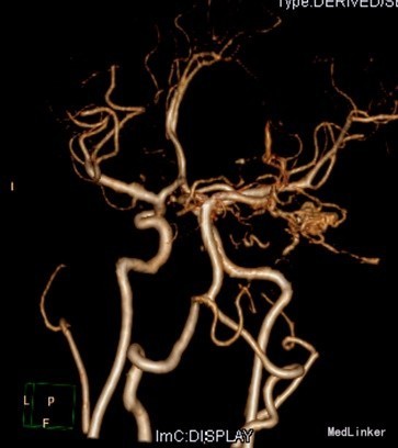 查体:昏迷,双瞳大形圆约3mm,四肢及肌力张力不合作。辅助检查:CT提示蛛网膜下腔出血,脑室铸型。头部CTA提示:广泛蛛血,脑室系统明显积血,脑实质稍肿,中线居中;右侧颞叶约侧脑室区积血内见增多、迂曲团状血管影,似主要由右大脑后动脉分支供血,考虑血管畸形可能性大。行全脑血管造影提示右侧小脑动静脉畸形,供血动脉来自右侧小脑上动脉、右侧大脑后动脉。