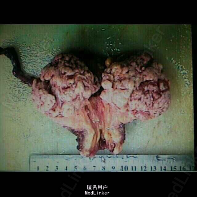 查体:外阴正常,阴道畅,可见少量白色分泌物,宫颈肥大,轻糜,宫体前位,如孕3+月大,表面规则,活动度可,有压痛,右妇科可触及一囊性包块,表面光滑,界限清楚,无明显压痛,左侧附件区未扪及明显异常。 妇科彩超:子宫增大,形态失常,宫壁多发小结节及左后壁实性占位,右卵巢囊性包块(26*21*24mm)。肿瘤标志物阴性。