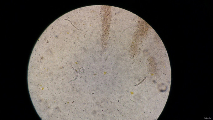 查体:入院查体:rI’37.3 oC,P108次/min,R21次/min,BPS0/50mmHg,神清,重度脱水貌,全腹压痛,剑突下压痛明显,肠鸣音稍亢辅查:查胃镜示:①幽门管、球部溃疡;②慢性浅表性胃炎;③肠道“钩虫”。胃内取样病理示:慢性炎症反应,粘膜表面见寄生虫卵,考虑为钩虫,大便WBC(++),OB(一)。血常规:WBC 10.8×i09/L,RBC3.23×1012/L,Hb 8.99/L,PLrr 140×109/L;血ESR:13mm/h;电解质:K+1.81mmol/L,Na+123retool/L,C1—85.9mmol/L,Ca“1.3mmol/L;肌酐188.8mmol/L,尿素氮10.6mmol/L,呕吐物OB(+)。心电图示①窦性心动过速;②心肌劳损;③Q—T改变。肠镜示直肠至盲肠粘膜肿胀,散在充血斑,盲肠粘膜息肉样隆起,表面糜烂出血,给予抗炎及纠正水电解质紊乱,症状未缓解。随即粪检:水样稀便,可见大量蛇形蠕动的幼虫,送鉴定:虫体平均长度为(260±1 0)nm,宽(12土0.5)nm,食道长(58±2)ilm,生殖原基可见,虫体末端尖细无分叉,确定为粪类圆线虫I期杆状蚴;取约19稀便,加生理盐水至5.Oml混匀,定量显微计数,’测得每g粪便虫体数为约135 200条,未见虫卵及成虫,