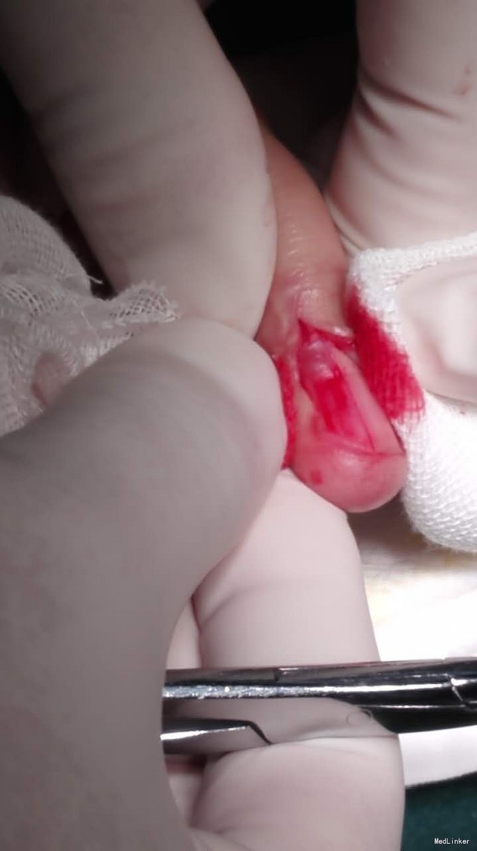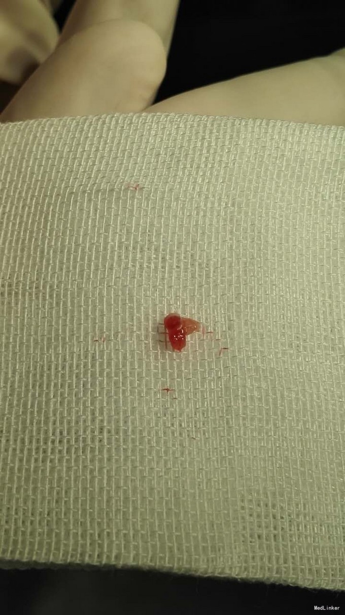 术后给予换药、拆线。局部疼痛消失。 血管球是位于皮肤中的一种正常结构,是小动、静脉之间的短路,有丰富的神经末梢,是交感神经及感觉神经末梢。血管球在肢体末梢较多,尤其是在手掌侧、足跖侧及手指足趾甲下分布较多。正常的血管球大小约1mm,有调节体温作用,与出汗有关。血管球内有血管球细胞,是一种内皮细胞,外被很薄的胶原网包绕,为何转变成瘤,机制不清。血管球瘤为直径2~3mm的圆形肿物,包膜完整,色深红或暗紫。单发性血管球瘤较常见,呈淡紫或暗蓝色结节,直径数毫米,常有显著触痛和自发性疼痛,严重者触痛呈剧烈放射性疼痛。但偶亦有无疼痛者。好发部位为甲下,但亦可发生于手指、臂部等处。指趾部损害多见于女性,发生于其他部位者,男性多见。高分辨率磁共振显像有助于手术确定肿瘤范围。肿瘤进行性增大,可引起溃疡。多发性血管球瘤少见,可呈常染色体显性遗传,多见于儿童,一般无触痛。临床上皮损类似蓝色橡皮疱痣,通常广泛分布于躯干,可多达数十个,皮损群集时可融合成团块。手术彻底切除多可治愈。去除局部指甲,甲床浅层即可见。在深层的需切开甲床。术中动作要轻柔,以免将包膜弄破不能完整取出。