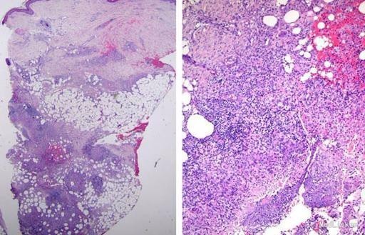 诊断:Bazin 硬红斑 皮肤活检显示了与此前活检相似的结果(见图 2)。抗酸染色和 PCR 检测均阴性。诊断为继发于结核菌素试验的 EIB。补充性试验排除了内脏器官结核。开始抗结核化疗,未发生不良反应,皮损消退。