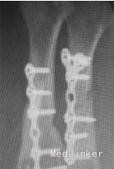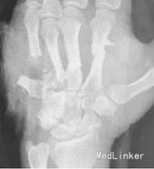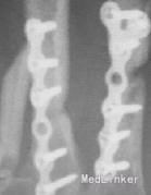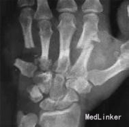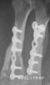 入院诊断左手损伤,左第2~5掌骨开放性粉碎性骨折,左第2~5指伸肌撕脱损伤,左手背软组织挫裂伤伴缺损,左中、小指指深屈肌腱断裂,左环指指深屈肌腱撕脱损伤,左手骨间肌、蚓状肌断裂、挫裂伤,左手指掌侧总神经、指背侧总神经及指神经断裂,左手指掌指总动静脉、掌浅弓、掌深弓断裂,左手掌软组织挫裂伤,左大小鱼际肌部分断裂,左桡骨下段横形骨折,左肘部软组织损伤。入院后给予急诊清创固定1周后左小指、环指缺血坏死,再次手术行左环、小指切除,左第5掌骨切除、左第4掌骨残端修整、左桡骨下端切开复位固定术,左第2、3掌骨骨折端术后5个月无愈合迹象。术后X线片提示:骨折断端存在间隙,骨痂很少或无,断端分离,髓腔封闭,骨质疏松,无骨小梁形成,符合骨折不愈合诊断。