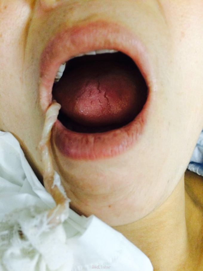 食管损伤主要因为医源或异物。这个患者可能因为吞饭团缘故。这个患者的口腔脱出的黏膜令人印象深刻。