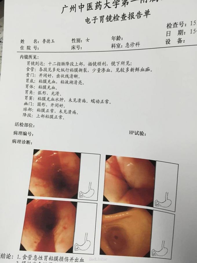 贫血貌,余查体无特殊。 21/10查血分析:HGB 74g/L、NEU% 78.2%;生化:K 3.41mmol/L;23/10复查血分析:HGB 86g/L,11月1日复查血分析:HGB 92g/L;10月27日、11月1日大便检查:隐血弱阳性;11月1日复查血钾正常,相关抗原五项、抗体筛选试验、尿组合、 糖化血红蛋白未见明显异常。彩超:双肾输尿管膀胱未见异常;肝胆胰脾未见异常;子宫肌层不均质改变,未排子宫腺肌症,请结合临床。心电图示:大致正常。 15-10-21急诊胃镜:见食管各段多处纵行粘膜撕裂,少量渗血,见新鲜血痂。
