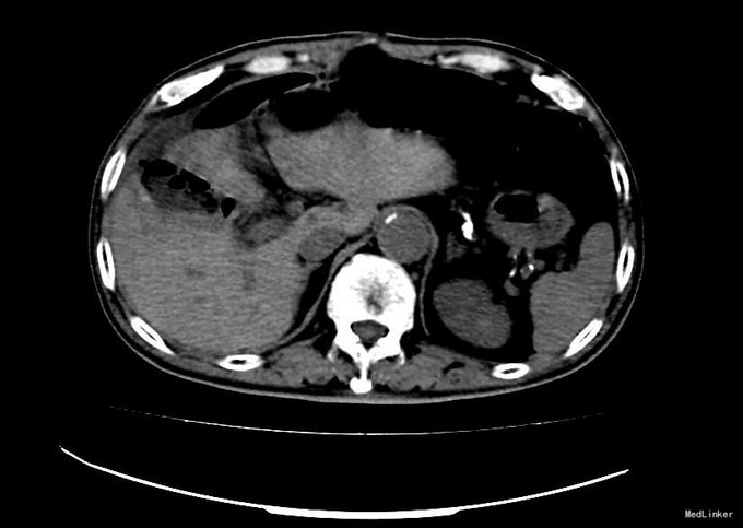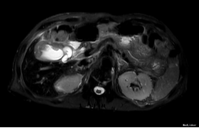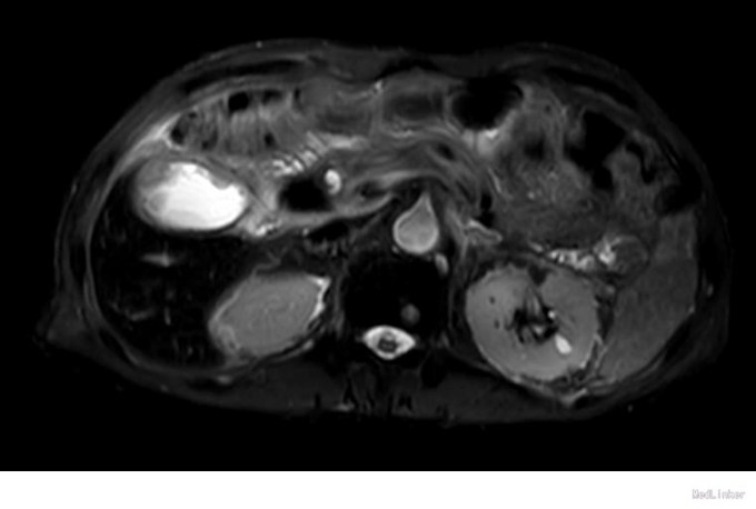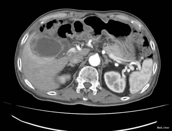 查体:右上腹轻压痛,无反跳痛、肌紧张。墨菲氏征弱阳性。 辅助检查:腹部CT:胆囊体积增大,壁增厚,以胆囊底部为著,增强扫描可见轻度强化,胆囊周围可见积液。MRI:胆囊增大,壁增厚,壁内可见多发结节状低信号灶。胆囊内可见泥沙样短T2信号影。