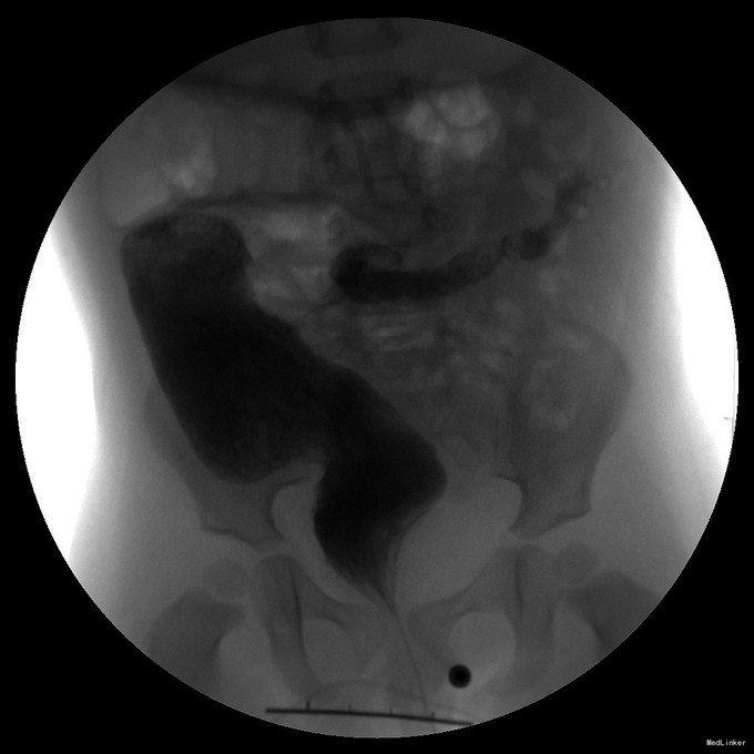 查体: 腹部稍膨隆,未见肠型及胃肠蠕动波,肛门指检稍狭窄,直肠壶腹空虚,退出指套无血染,无明显刺激性排气排便。 辅查: 钡灌肠:乙状结肠扩张,内见粪石。