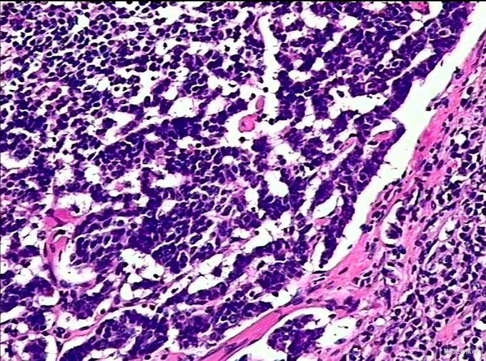 胸腺神经内分泌细胞肿瘤分为两大类,一类是胸腺类癌,另一类是胸腺小细胞癌。1/3~1/2 的患者在手术确诊前无症状,于胸部 X 线检查中无意发现。而少数患者仅有前胸疼痛、咳嗽、咯血、气促等非特异性症状。