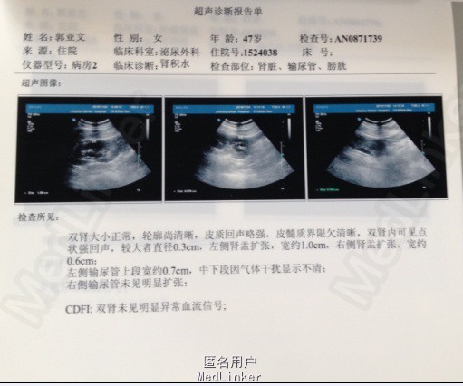 双肾区无叩击痛,双输尿管走形区无压痛。耻骨上区隆起,叩诊浊音。排尿后留置尿管引流尿液400ml。 辅助检查:肌酐99。 ct:双肾及输尿管积水。 留置尿管后一周泌尿系彩超:双肾积水明显减轻。具体见图片。
