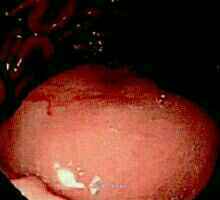 胃镜提示胃底部和胃窦部有小片状糜烂。腹部CT结果提示:近胃角部胃浆膜面肿块,首先考虑胃肠道间质廇。血常规,生化等未见明显异常。治疗:评估手术指征和能否耐受手术, 向病人及其家属交代病情, 签署手术同意书,手术室内采用气管插管全身麻醉,常规消毒铺巾,通过手术切除肿瘤治疗。后把切除组织送病理,经病理确诊为良性。术后给予抗感染等对症治疗,病人康复出院,经半年的随访未有见复发。