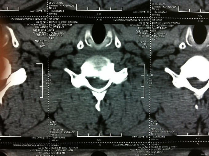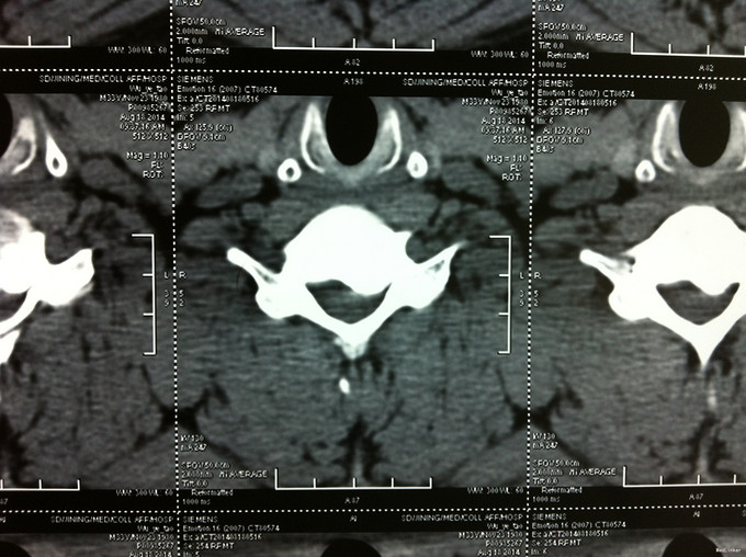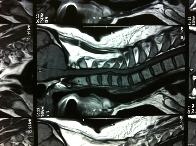 查体:左侧前臂及手感觉减退,右侧正常,左侧伸腕、伸肘肌肌力4级,右侧伸腕、伸肘肌肌肌力4-5级,双侧霍夫曼综合征阳性,双下肢肌张力高,膝腱反射+++,巴氏征阳性,辅助检查: X-ray:劲椎退行性变 CT及MR:颈椎间盘突出,腰5/6,6/7间盘突出并骨赘形成