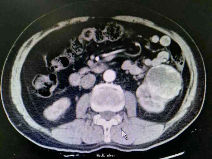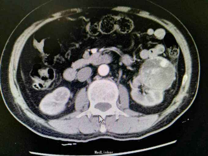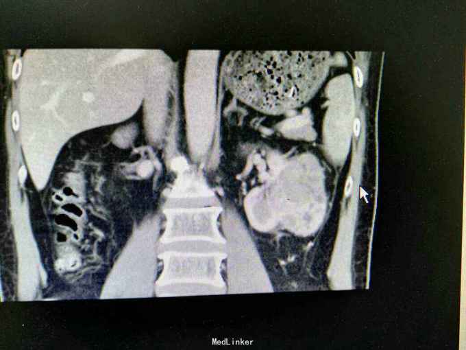 体查未见明显异常。 CT:左肾外生性肿物,6.5x5.7cm,考虑肾癌 ECT:双肾功能良好。