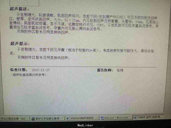 患者女,39岁,因停经7+5周,阴道流血11 天入院。患者平素月经规则 10-15天/30天,LMP:2 015-09-30。患者停经1月自测尿妊娠试验(+).就诊于南方医科大学第三附属医院查尿MT(+),早孕两项示:P:105.9nmol/L HCG: 26365 mlU /ml。 11天前无明显诱因出现阴道流血,量少,用护垫即可,颜色初为浅红色,后为鲜红色,偶有黑色小血块,无伴肛门坠胀感,无伴腹痛、腹泻,无恶心、呕吐,无尿频、尿急等不适。于南方医科大学第三附属医院就诊,B超提示:子宫增大,富内(宫腔中下段)妊娠胚胎存活.大小约6 + 周(孕囊距宫颈内口约lcm,大小约31mm*17mm* 22mm)。予中成药(具体不详)保胎治疗,服药1周后,就诊于中山大学附属第一医院,予孕酮、叶酸治疗,服用孕酮1次后自行停用,服用叶酸 至今。今日就诊于我院门 诊,阴道分泌物检查示:可见念球菌菌丝。查超声示:子宫稍 增大,宫腔下段见孕囊(相当于.妊娠约8+周),考虑瘢痕妊娠可能性大。拟以“瘢痕妊娠;念珠菌性阴道炎”收入院。 其他病史:7年因“骨盆狭窄;脐带绕颈1周”于中山大学附属第一医院行剖富产术。1年因“卵巢囊肿”于 我院行“卵巢囊肿剔除术”(为单侧,具体左右不详)。