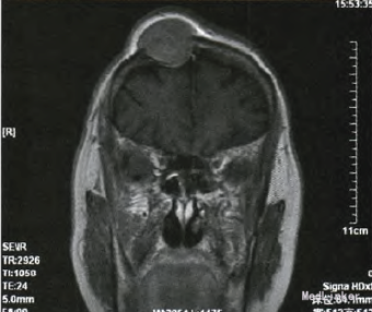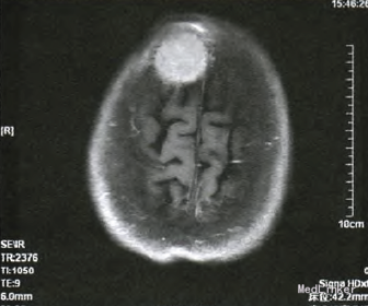 人院行体格检查发现:右侧前额部包块,隆起明显,直径约5cm,形态规则,表面光滑,质软,边界清,无触痛,活动度差,周围可触及动脉搏 动。患者未诉有任何疼痛、瘙痒等不适,追问病史,诉3个月前偶然发现该肿物,生长缓慢。右侧前额部包块超声检查结果见:皮下软组织内可探及范围约2.8cm×2.2cm×3.2cm的低回声包块,侵犯颅骨,形态尚规则,边界尚清,内回声尚均匀,可及动静脉血流信号,可引出动脉频谱,Iu:0.90。考 虑恶性肿瘤转移可能。行头颅MRI增强扫描,提示:右额骨区可见35mmx35ram×37ram大小占位病变,病变破坏颅骨内外板并膨胀性改变,增强扫描 明显强化;余颅内未见明确异常信号,脑室系统及脑沟、脑裂增宽;中线结构无移位,符合恶性肿瘤改变。