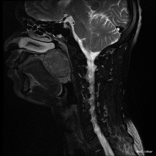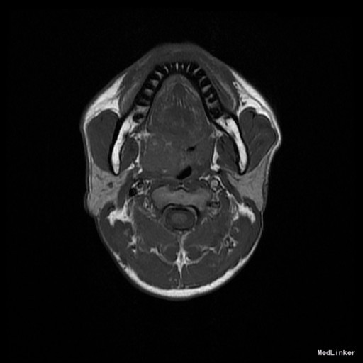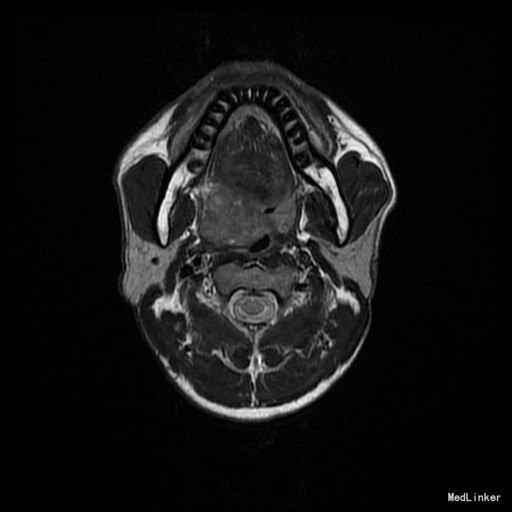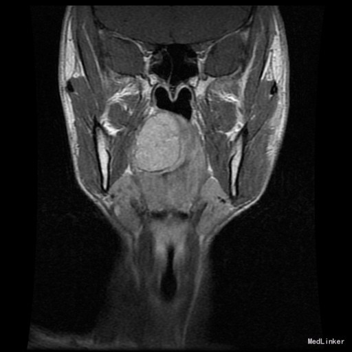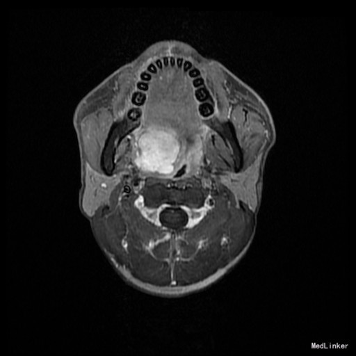 查体:右侧软腭至硬腭处见一肿物,约5*3cm,质硬,固定,边界欠清,表面粘膜光滑。 辅助检查:外院颌面CT提示:右侧软腭实性占位,并累及鼻咽、口咽壁,建议MRI增强检查。