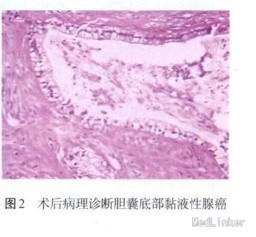 术前诊断:胆囊癌。 予行手术切开胆囊见胆囊底部2.0 cm 不规则肿块,快速冰冻病理检查诊断为胆囊癌,行胆囊癌根治术(胆囊切除+肝脏 楔形切除+肝门部淋巴结清扫术)。术后病理:胆囊底部黏液状腺癌。1005-2208(2012)11-0969-02