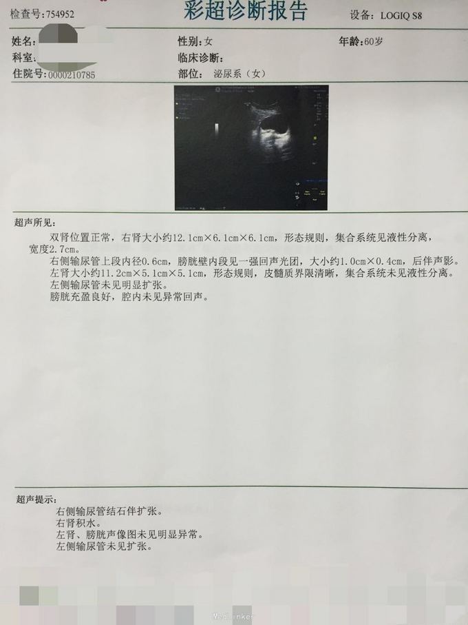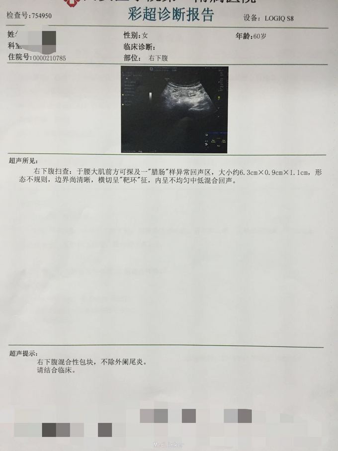病例特征:女性患者,60岁; 主诉:右侧腰腹痛3天 现病史:患者3天前无明显诱因下出现右侧腰背部阵发性疼痛向右下腹放射。伴恶心呕吐。尿频、尿急、尿痛。无排尿困难及尿失禁发生。为求进一步治疗遂来我院,查泌尿系B超提示:右侧输尿管上段距肾盂输尿管连接部2厘米可见结石大小1.1厘米,右肾积水。门诊遂拟“右输尿管结石”收住我院泌尿外科,专科治疗后患者右下腹症状未能完全缓解,后经我科医师会诊以急性阑尾炎转入我科进一步治疗。 既往病史:对青霉素过敏;3年前因胆囊结石行腹腔镜下胆囊切除手术,术后恢复佳。