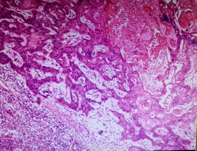 本患者目前尚未发现转移,要求患者定期随访。 鳞状细胞癌又名表皮癌,是发生于表皮或附属器细胞的一种恶性肿瘤,癌细胞有不同程度的角化。多见于有鳞状上皮覆盖的部位,如皮肤、口腔、唇、食管、子宫颈、阴道等处。此外,有些部位如支气管、膀胱、肾盂等处虽无鳞状上皮覆盖,但可通过鳞状上皮化生而形成鳞状细胞癌。