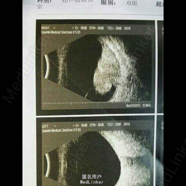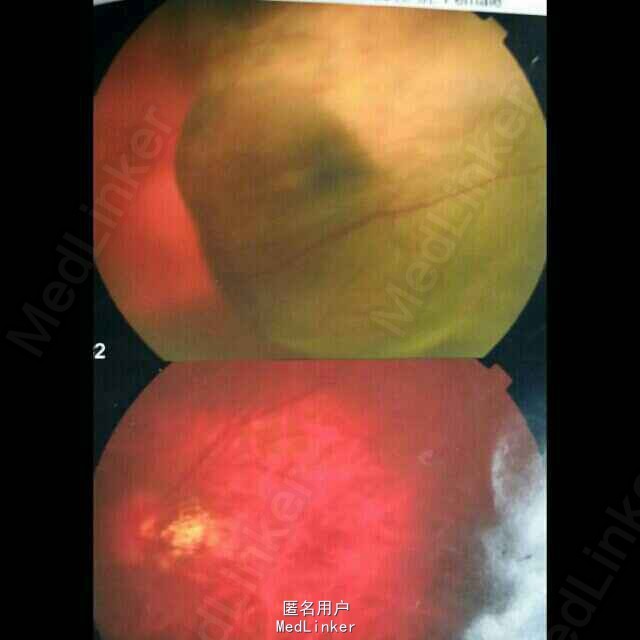 检查:右眼角膜透明,晶体混浊,视网膜隆起,视网膜下黑色肿物。左眼角膜透明,晶体混浊,豹纹状眼底改变。辅助检查:眼眶MRI示右眼恶性黑色素瘤伴视网膜脱离可能。