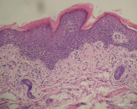 体检:患者一般情况尚可,各系统检查无异常。皮肤科检查:见双足跟、足底处角化过度性边界不清的红斑伴少许脱屑,有数条与皮纹方向一致的皲裂,无脓疱,无明显薄膜和点状出血现象,不伴关节的红肿热痛及甲损害。血常规、肝功能均正常;足底皮损真菌镜检阳性,快速血浆反应素环状卡片试验(RPR)阴性。足跟处皮损组织病理检查:表皮角化过度、角化不全,角质层下出血,颗粒层消失,棘层水肿、海绵形成,淋巴细胞移入表皮,真皮乳头层内血管扩张、红细胞外渗,血管周围淋巴细胞浸润。
