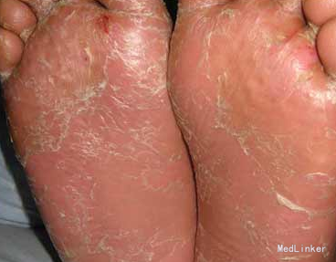 患者男,41岁。因双足跟、足底角化过度性红斑、皲裂伴痒4个月余来我科就诊。4个月前,双足跟处无明显诱因出现红斑、皲裂,痒痛不适,皮损渐扩大至整个足跟,以右足跟明显,表现为角化过度性红斑,肥厚,少许鳞屑,院外查真菌镜检阳性,诊断为足癣,给予曲安奈德益康唑软膏、萘替芬酮康唑软膏,治疗1个月后瘙痒明显减轻,皲裂好转,但双足跟红斑角化仍较明显,给予曲安内奈德益康唑软膏:复方苯甲酸软膏:15%尿素霜封包治疗每天1次,2周后红斑变暗,角化过度仍明显,继续封包治疗2周后,痒感加重。既往体健,无不良嗜好,家族中无类似病例。