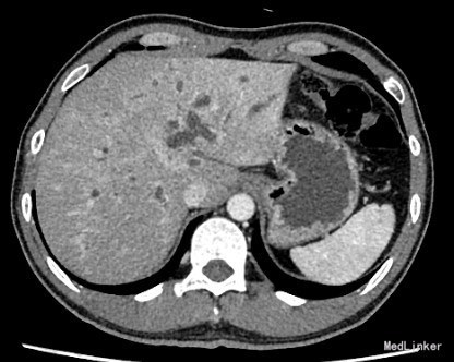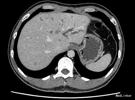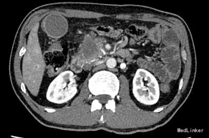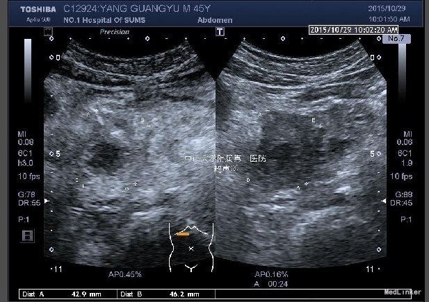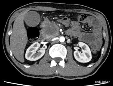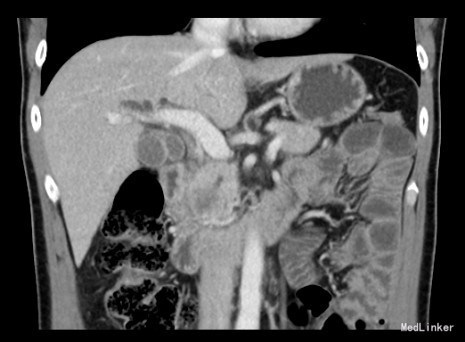 男,44岁,因“反复上腹部隐痛不适1月余,进行性身目黄染1周”入院。患者自诉1月前出现无明显诱因上腹部隐痛不适,呈持续性,可耐受,遂就诊于北滘医院,完善相关检查:CA199>10000u/ml,腹部CT示:1.胰头区占位病变,2.腹膜后见多个淋巴结转移,3.肝内外胆管扩张。考虑“胰头癌”可能性大。我院腹部CT会诊结果如下:胰头肿物,考虑胰头癌,肿瘤侵犯肠系膜上静脉。1周前,患者出现身目黄染,且呈进行性加重趋势,遂患者今为求进一步诊治,前来我院就诊,患者至起病来,精神、睡眠及食纳尚可,大小便正常,体征无明显改变。