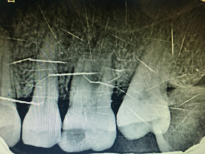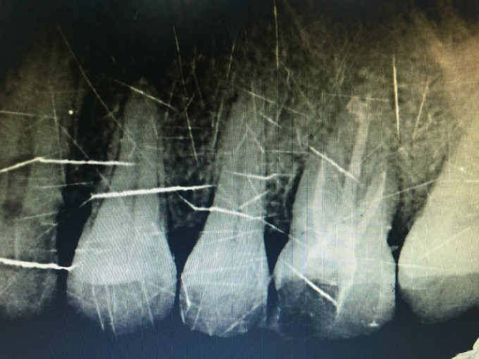 临床检查:26近中龋坏可探及穿髓点,无窦道,探疼(+),冷(++),叩(-),松动度(-),牙周红肿,牙石1度 辅助检查:X线示26龋坏累积髓腔。