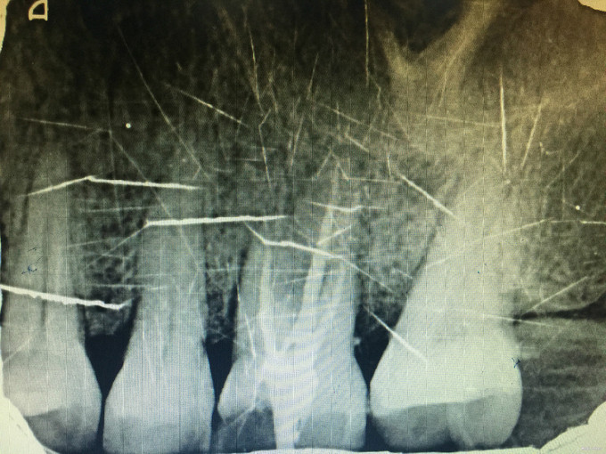 诊断:26牙髓炎 治疗:经患者知情同意后,26局麻去腐降牙合,开髓拔髓寻找根管口,建立直线通路,扩通根管,确定工作长度。S3/EDTA凝胶镍钛器械,次氯酸钠冲洗根管,预备至35/04,氢氧化钙诊间封药,一周后复诊,试主尖X线示恰充,试干根管,导AH-PLUS糊剂,VDW热压胶垂直加压根充,术后见根管恰充,暂封调合抛光。树脂充填。
