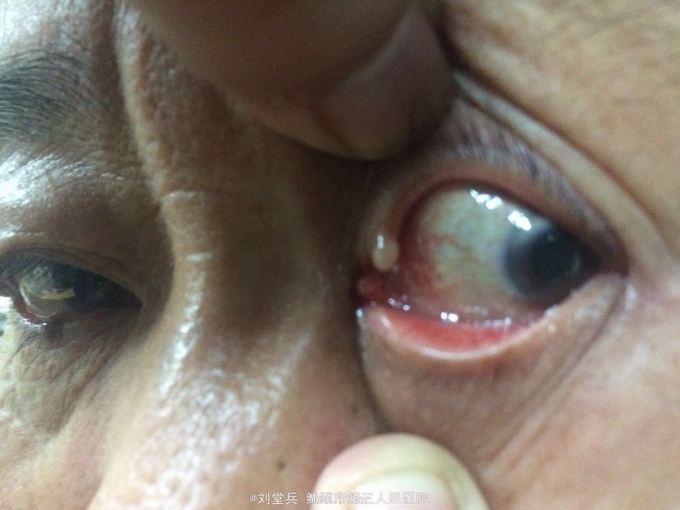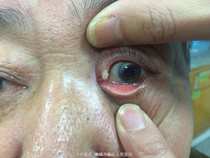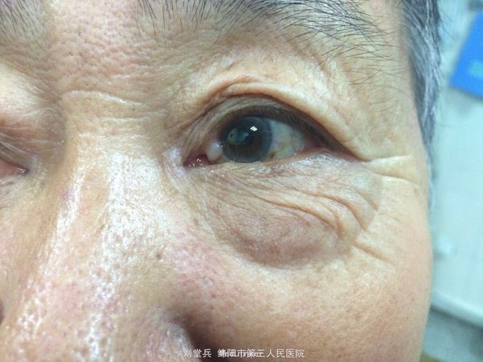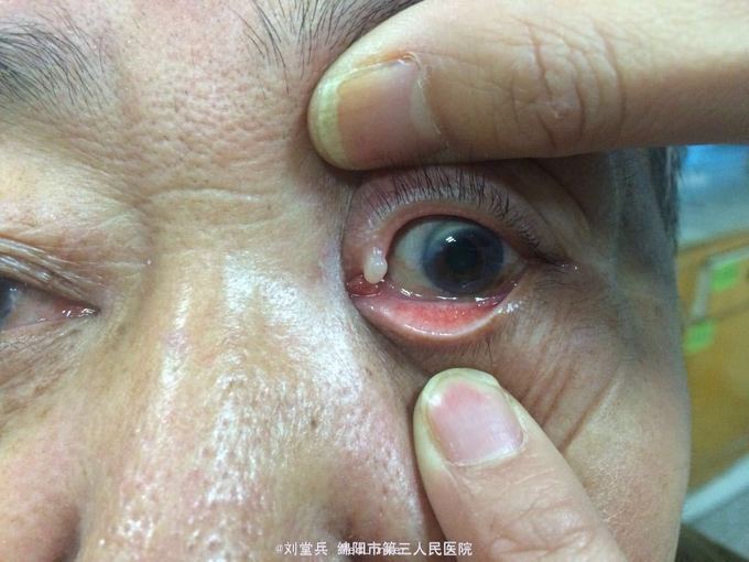 男,63岁,因“左眼上泪小管区肿物逐渐长大30+年,伴流泪2周”入院。