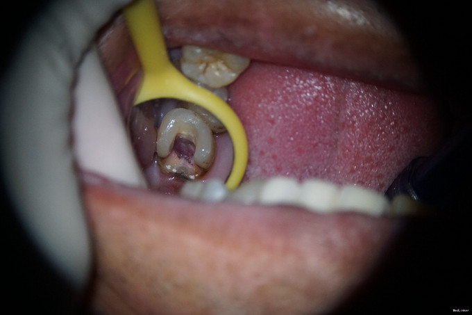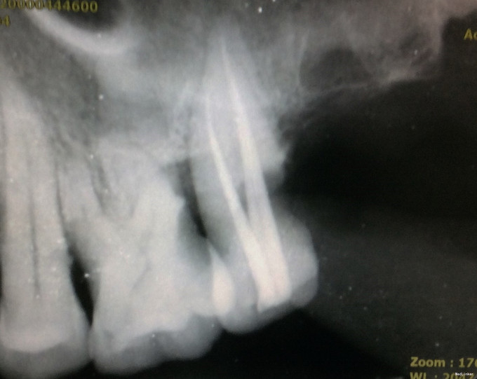 检查:27牙远中邻he面见大面积龋坏组织,质软,探及穿髓孔,探(-),叩(+-),根尖区扪(+-);松动I度;颊侧牙槽粘膜及牙龈未见明显窦道。28牙于我科就诊时已拔除。 全景片示27牙远中低密度影,累及髓腔;无清晰根管影像;牙槽嵴高度正常;牙周膜间隙正常;根尖周组织未见低密度影。