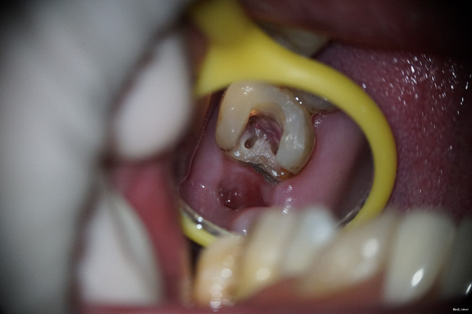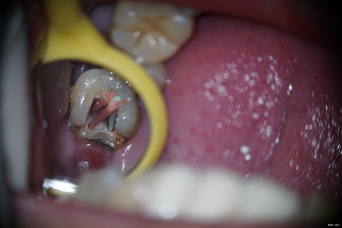 1、从全景片中可见,该牙龋坏已与髓腔相通,髓腔较为明显。但开髓时发现,髓腔内几乎均钙化,髓腔空间及其狭小。且该牙解剖牙冠长,且为上颌最后颗磨牙,若对牙体解剖没有足够地掌握,没有充足的经验,非常容易开髓开偏或找不到根管口,或有遗漏根管,因为近颊根根管口被钙化的牙体组织完全覆盖。此种情况下,若使用涡轮机企图去除牙体组织后寻找根管口非常困难,若在显微镜下使用超声则为最佳选择。 2、该牙虽然冠的上部牙体组织无去坏,但仍然去除掉了。虽然对牙齿的创伤较大,但若不去除这些无机釉,一来可能龋坏无法去除干净,二来抗力形不足,容易折断。 3、该牙髓腔内牙髓完全坏死,但各个根管内均有较好牙髓活力。说明牙髓的坏死是一个渐进的过程,即便是髓腔及根管开始钙化,牙髓也可有活力。