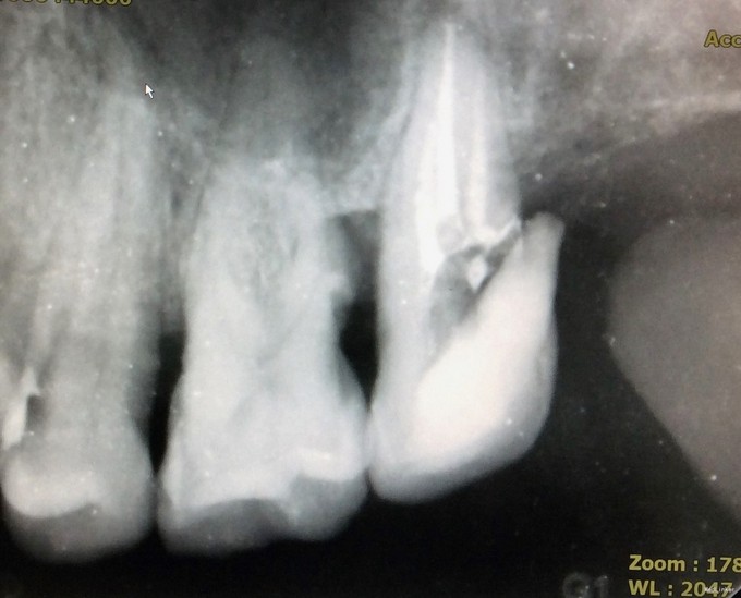 诊断:27牙慢性牙髓炎 治疗方案: 1、27牙根管治疗+充填修复+冠修复 2、27牙显微根尖外科手术 3、27牙干髓术 4、46牙择期治疗 经与患者详细介绍每种治疗方案的治疗经过、费用及预后,患者选择方案1。 治疗经过: 初诊:因患者咽反射强,无法上橡皮障。27牙涡轮机去龋,未去净龋坏时见穿髓孔,但因髓腔钙化及解剖牙冠长,不能探及明显髓腔结构;ET20清理髓腔内钙化,探及3根管口。其中近颊根根管口探痛明显,封“三聚甲醛”;CAVITON暂封。 首次复诊:27牙去净暂封,根测仪测定根管长度,近颊根19mm,远颊根19mm,腭根20mm;机用镍钛器械Protaper清扩至#2506锥度,腭根清扩至#3504锥度,示尖到位;超声荡洗,次氯酸钠冲洗,纸尖吸干,根管内封氢氧化钙,髓腔置干棉球,CAVITON暂封。 二次复诊:27牙去暂封,去棉球,超声荡洗根管,次氯酸钠冲洗,再次测量根管长度,纸尖吸干,AH糊剂+大锥度牙胶尖封闭根尖段,热牙胶封闭根中上段,拍片示根充到位;腭根预备纤维桩道,冲洗,干燥,粘接#13纤维桩;涂布粘接剂,流体树脂垫底,3M纳米树脂充填修复,调he,抛光。