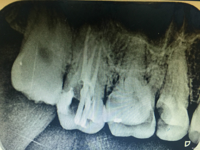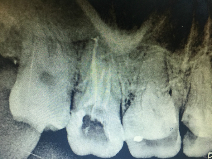 诊断:17继发龋 治疗:经患者知情同意后,17局麻去除原有充填物降牙合,开髓拔髓寻找根管口,建立直线通路,扩通根管,确定工作长度。S3/EDTA凝胶镍钛器械,低浓度次氯酸钠冲洗根管,预备至35/04,氢氧化钙诊间封药,一周后复诊,试主尖X线示恰充,试干根管,导AH-PLUS糊剂,VDW热压胶垂直加压根充,术后见根管恰充,暂封调合抛光。术后观察嵌体修复。