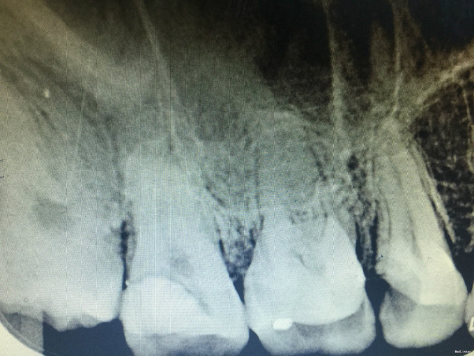 主诉:右上后牙疼痛不适数日 现病史:数日来,患者右上后牙曾行树脂充填治疗术近日来疼痛不适影响进食睡眠来诊。 既往史:健康 过敏史:青霉素过敏
