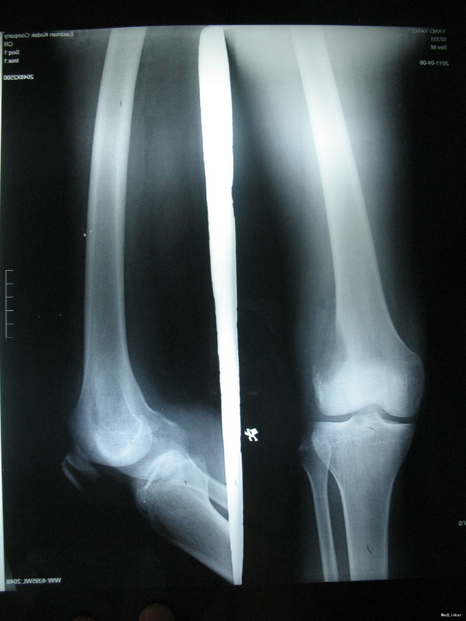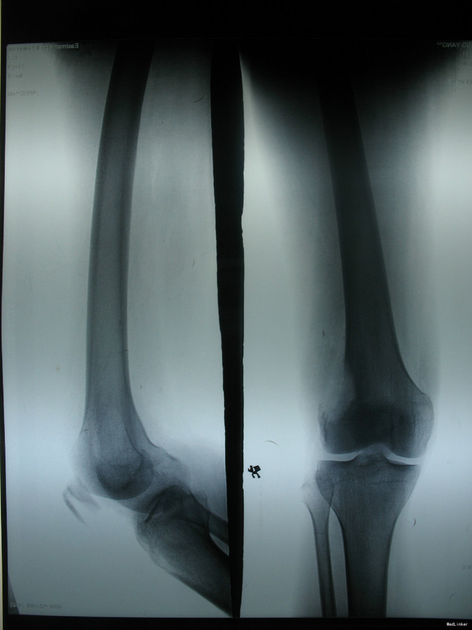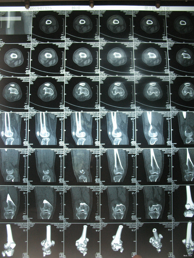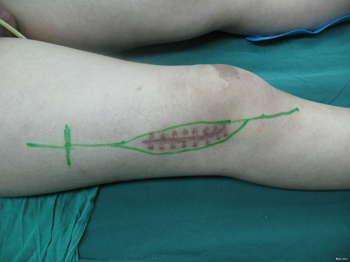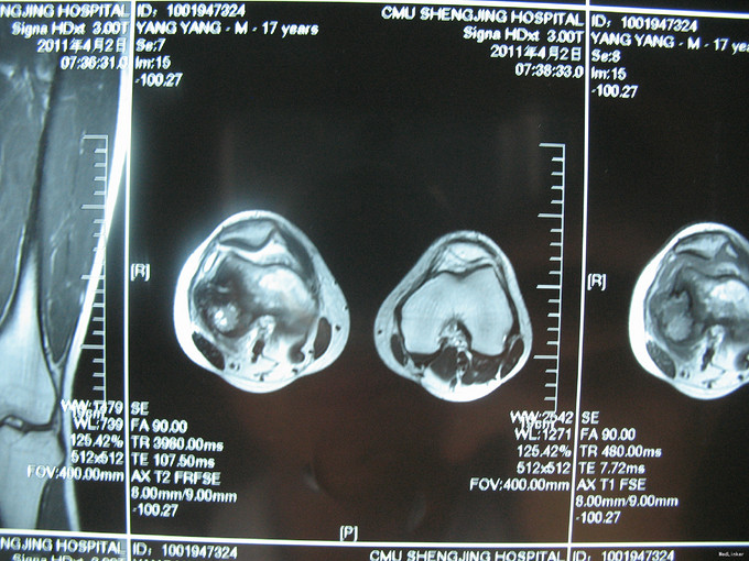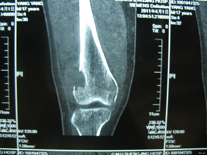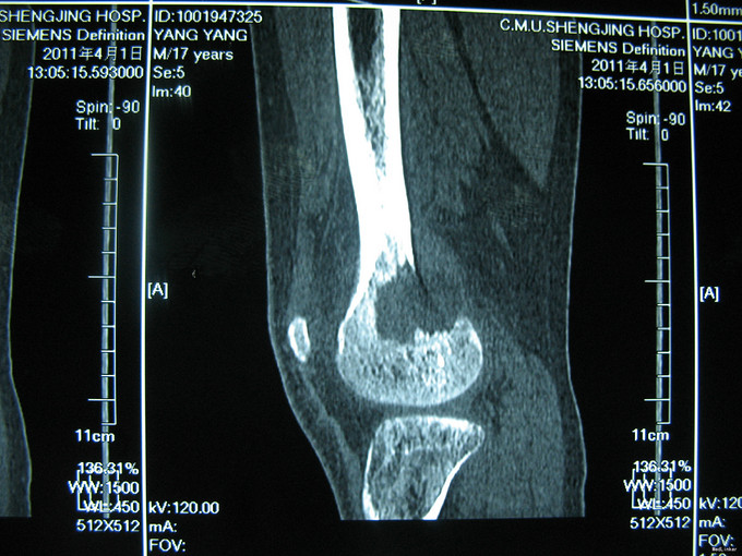 右膝上疼痛2个月肿胀一周 患者2个月前无明显诱因出现右膝上疼痛,逐渐加重,一周前活动后加重明显并开始出现肿胀,右膝关节活动受限,于当地医院行CT及MRI检查考虑为恶性肿瘤,遂来我院治疗。