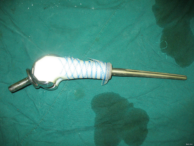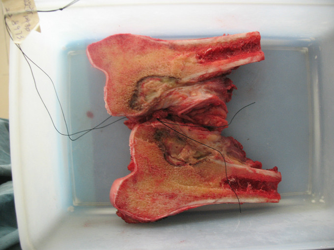 入院后完善相关检查,诊断为股骨恶性肿瘤,考虑为骨肉瘤。切取部分肿物病理活检。病理明确诊断股骨骨肉瘤后,给予新辅助化疗。化疗效果明显,手术行瘤段切除人工假体置换术。