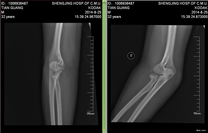 患者6小时前不慎摔倒,右手着地,当时即感右肘部剧烈疼痛,活动受限,被家人急送往奉天医院急诊,拍片检查示:右桡骨近端骨折,以“右桡骨骨折”收入院,现为进一步诊治,来我院就诊,以“右桡骨骨折”收入院,患者病来无头晕头痛,无恶心呕吐,无咳嗽咳痰,无发热寒战,饮食睡眠正常,二便正常,体重无明显减轻。