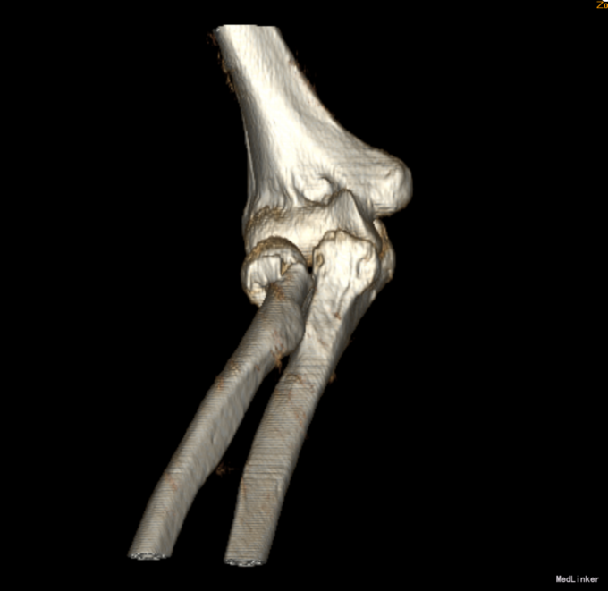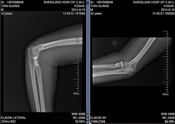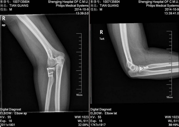 入院后完善检查,查无手术禁忌症后行右桡骨颈骨折切开复位内固定术,术后抗炎、接骨等对症治疗。术后第二天康复锻炼。术后2天一次换药,14天后出院。